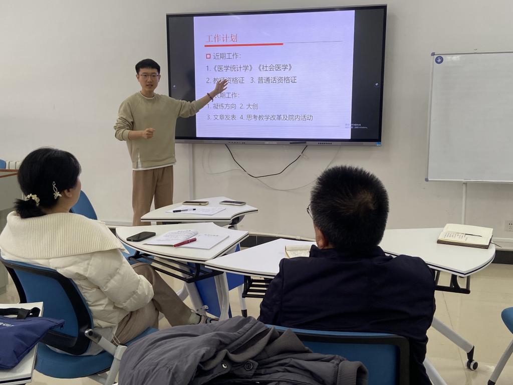 健康服务与管理教研室新入职教师潘冠辰围绕学习性听课、教学设计培训、未来发展规划等方面进行了汇报,在教学方法、课堂设计、自我反思等反面有了进一步的思考。