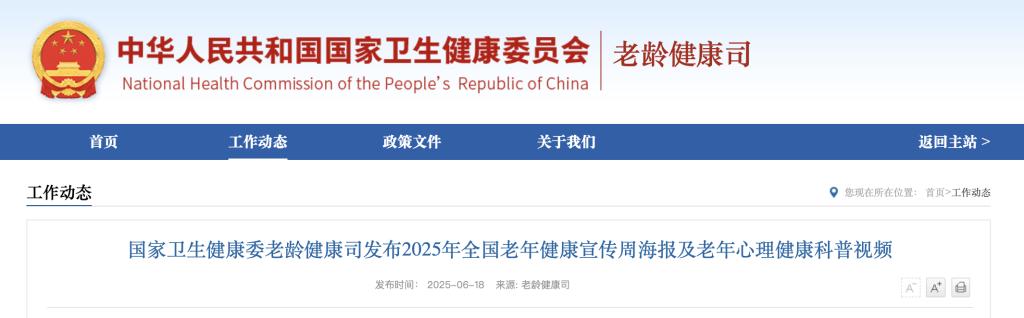 为贯彻落实《健康中国行动(2019-2030年)》《“十四五”健康老龄化规划》《加强中医药老年健康服务工作实施方案》和“精神卫生服务年”有关要求,宣传普及老年健康政策和科学知识,切实提高老年人健康素养和健康水平,国家卫生健康委和国家中医药局以“银龄健康,从心启航”为主题,于2025年6月23日-29日组织开展2025年全国老年健康宣传周活动。为做好宣传工作,国家卫生健康委老龄健康司组织制作了2025年全国老年健康宣传周海报及老年心理健康科普视频(《进入老年,您做好准备了吗?》《“情绪障碍”,您了解吗?》《远离阿尔茨海默病》《别让坏情绪偷走您的“脑活力”》),供各地宣传使用,供广大老年朋友及家人学习观看。