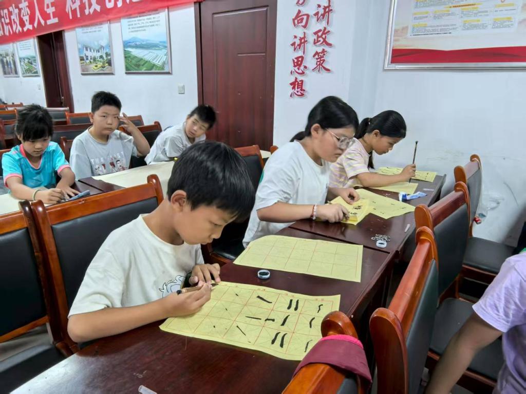 为实现学课教育与素养培育协同推进,团队构建“基础学科+特色拓展”双轨课程体系。语文课以“家乡叙事”为切入点,引导孩子们观察村庄里的“村中桃树”“庭院炊烟”,用文字记录乡风物貌,在生活语境中提升表达能力与写作能力;英语课打破传统教学模式,通过“水果单词接龙”“情景对话扮演”等趣味活动,驱散语言学习的畏难情绪,帮助孩子建立表达自信。特色拓展课程同样精彩纷呈:摄影课上,孩子们用镜头捕捉乡村晨曦与落日余晖;手工课中,用黏土塑造犁耙、谷穗等农耕符号;书法课里,在笔墨流转间感受汉字的方正之美,在多元体验中提升审美素养,厚植文化认同。