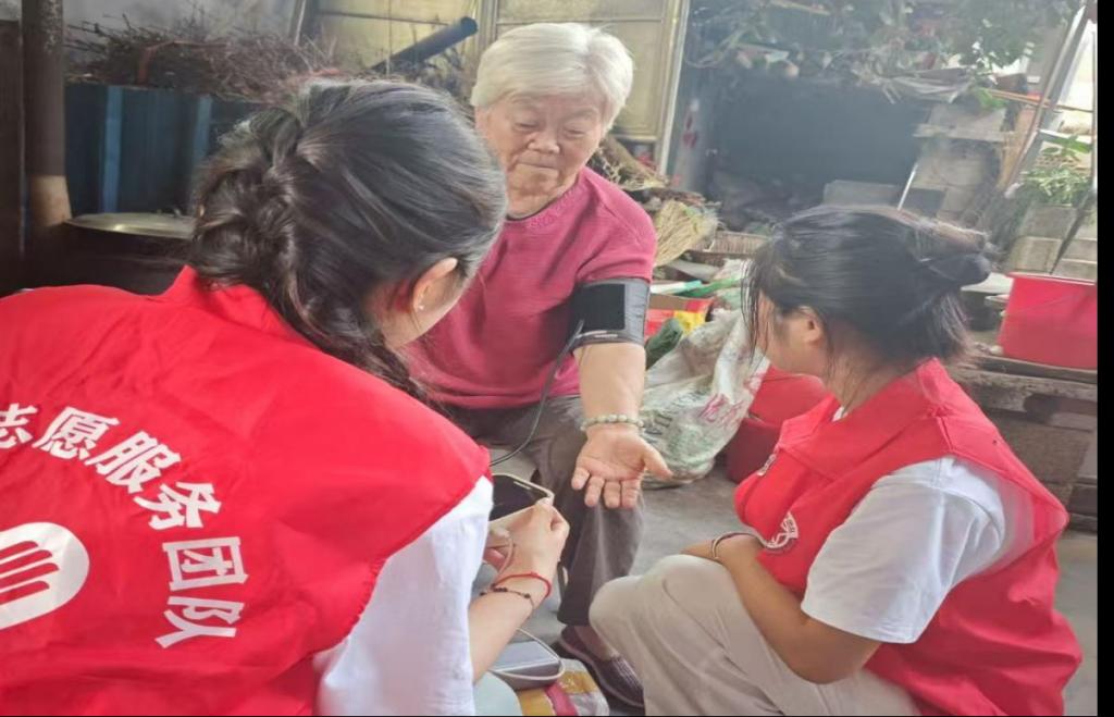 团队将红色教育融入实践全程,通过“故事化叙事+沉浸式体验”唤醒红色基因,培育孩子们的家国情怀。“童心向党”课堂上,志愿者以温庄村振兴历程为脉络,结合老党员口述的奋斗故事,生动再现村庄“从泥泞土路到水泥大道、从茅草土房到宜居小楼”的时代变迁,让孩子们直观感受发展力量。队员们还专程走访慰问在党五十载老党员,聆听奋斗史诗,记录红色记忆,同时发挥专业优势为老人提供血压测量、慢性病咨询等义诊服务,量身定制《老年健康护理指南》,在践行医学使命的同时,树立奉献社会的标杆。
