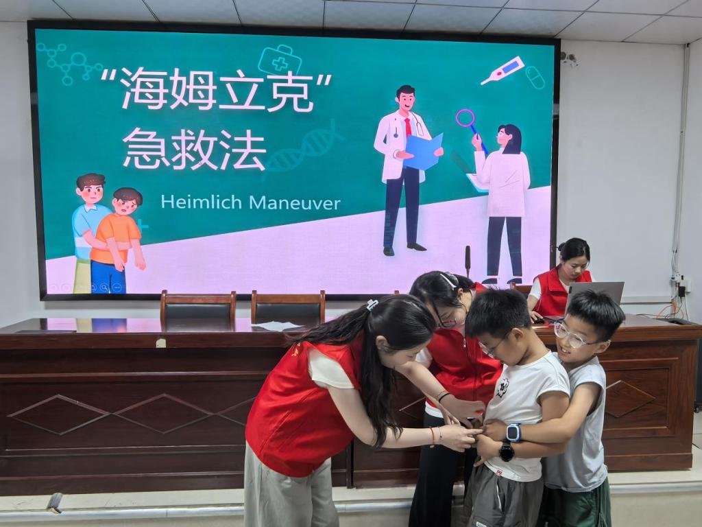 聚焦乡村常见安全隐患,团队构建“风险预判-理论讲解-实操演练-场景复盘”四维教学体系,全面提升儿童应急处理能力。在海姆立克急救法教学中,队员分场景演示成人与儿童操作差异,组织孩子们通过角色扮演反复实操,确保每一个动作标准规范;烫伤处理课程融入错误案例分析,手把手指导“冲、脱、泡、盖、送”五步法模拟训练,让应急流程深植于心;针对夏季水域安全隐患,开展防溺水专题教育,着重强调“智教优于盲救”原则,通过情景模拟让孩子掌握风险应对技巧,筑牢安全防线。
