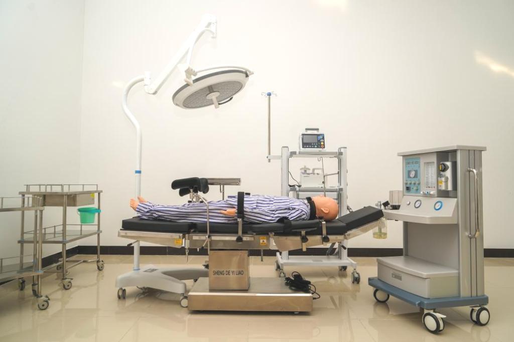 1.实训设施:实训室拥有整套先进的外科手术基础设备,包括模拟手术床、无菌操作台、无影灯、阅片机、麻醉机、吊塔等。